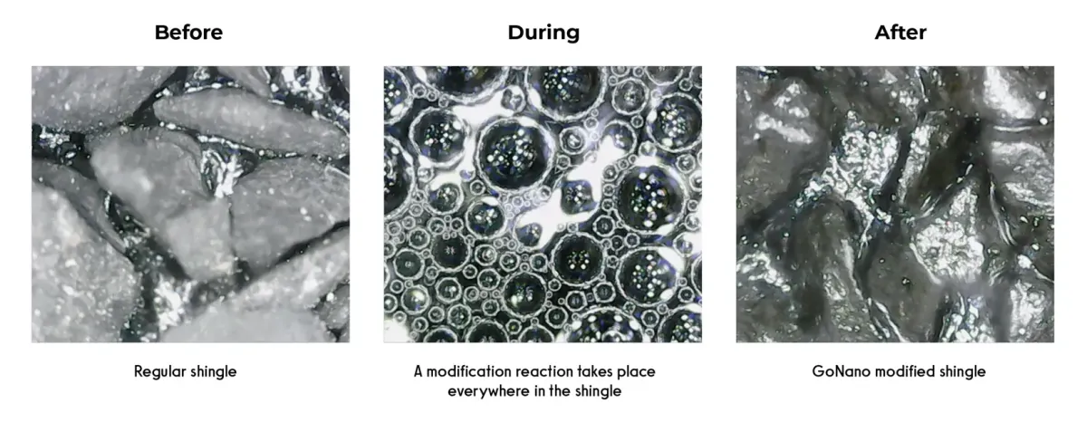 The evolution of GoNano technology created a shift in how sealants are approached. A regular shingle is sealed with oil, filling up the space in between shingles. GoNano modifies the molecular structure of asphalt shingles permanently. After application, a reaction occurs within each shingle. This reaction fuses both organic and inorganic material, creating new chemical links, called S1 particles. These S1 particles link shingle granules together, working from the inside out, creating a unified barrier against environmental strains and saves you money by extending the lifespan of your roof.